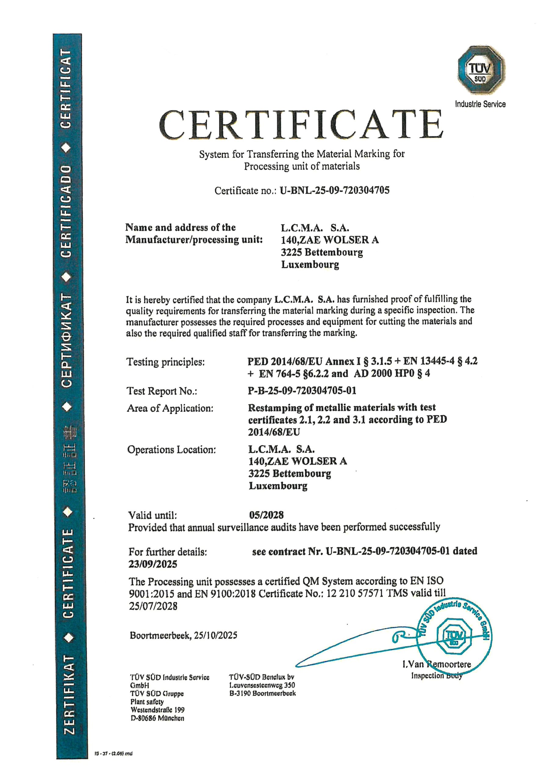 L.C.M.A. S.A. is ISO 9001 and EN 9100 : 2018 aerospace approved.
